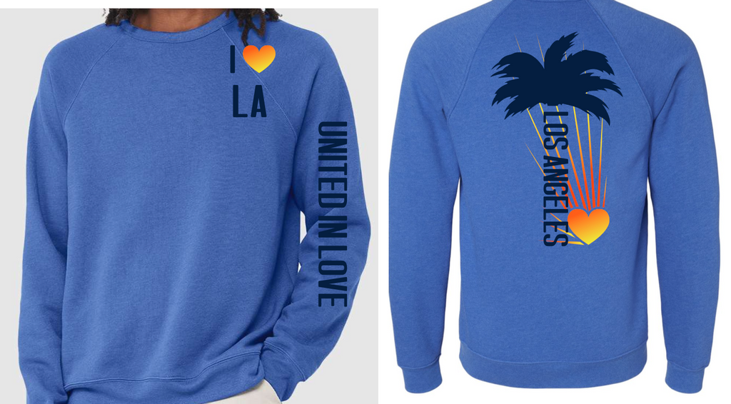 Show your LA Pride in our super cozy Fleece Unisex Fit Raglan Crewneck. Front print I Love LA, Sleeve print " United in Love" and large back Palm tree/ Los Angeles Print.