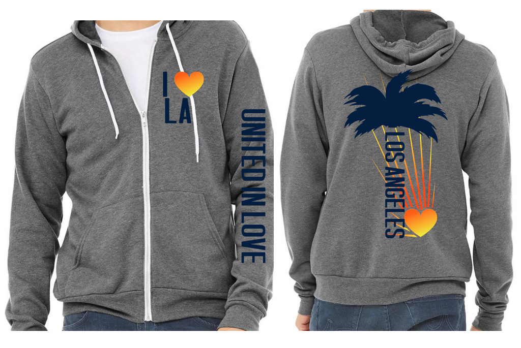 Show your LA Pride in our super cozy Unisex Fit Fleece zip hoody. Front print I Love LA, Sleeve print " United in Love" and large back Palm tree/ Los Angeles Print.